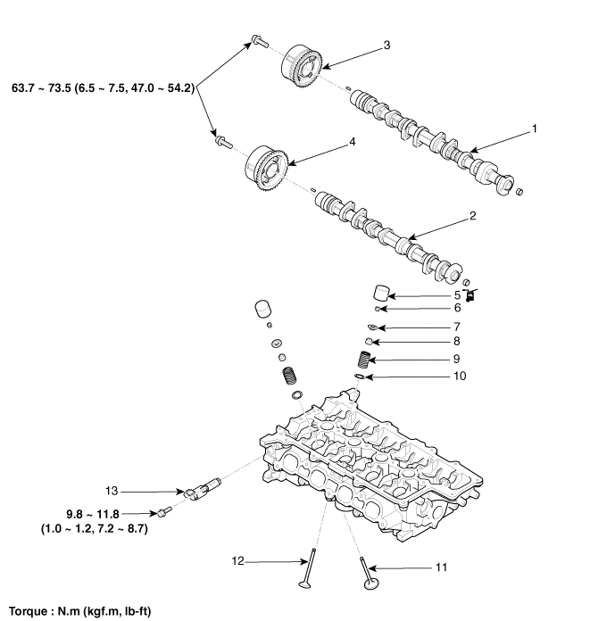9. Пружина клапана 10. Седло пружины клапана 11. Впускной клапан 12. Выпускной клапан 13. Масляный регулирующий клапан (OCV) |