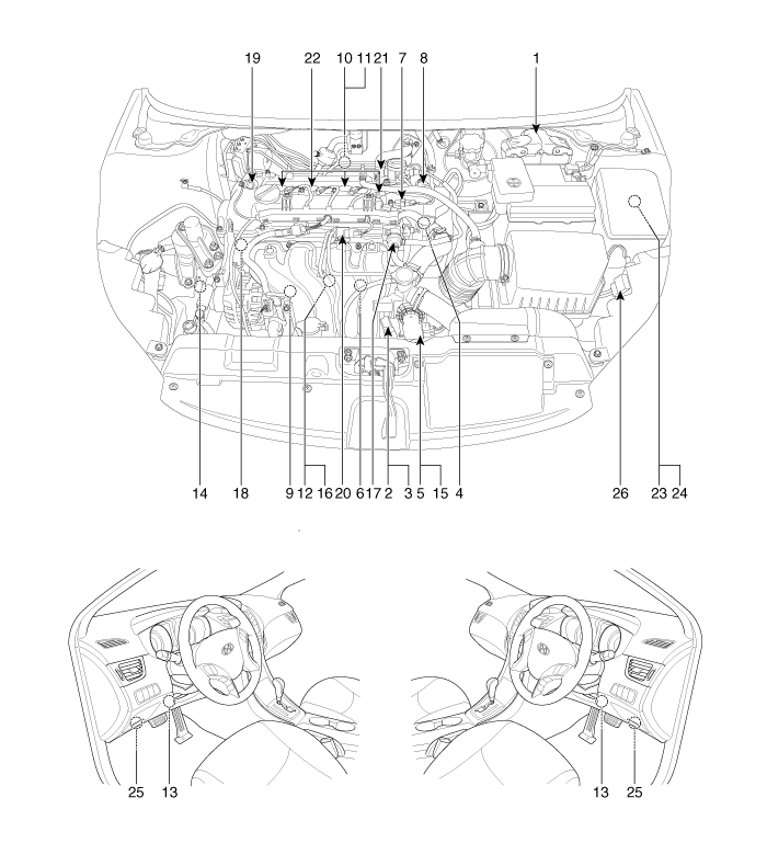 15. Двигатель ETC [интегрирован в модуль ETC] 16. Инжектор 17. Электромагнитный клапан управления продувкой (PCSV) 18. Масляный регулирующий клапан CVVT (OCV) [ряд 1/впуск] 19. Масляный регулирующий клапан CVVT (OCV) [ряд 1/выхлоп] 20. Электромагнитный клапан переменного впуска (VIS) 21. Клапан контроля давления топлива (FPCV) 22. Катушка зажигания 23. Главное реле 24. Реле топливного насоса 25. Разъем канала передачи данных (DLC) [16-контактный] 26. Универсальный контрольный разъем [20-контактный] |