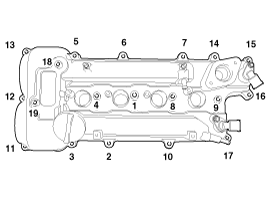 Затяните болты крышки головки блока цилиндров (А) в порядке и шагах.