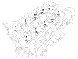 Равномерно ослабьте и снимите 10 болтов крепления головки блока цилиндров в несколько приемов.