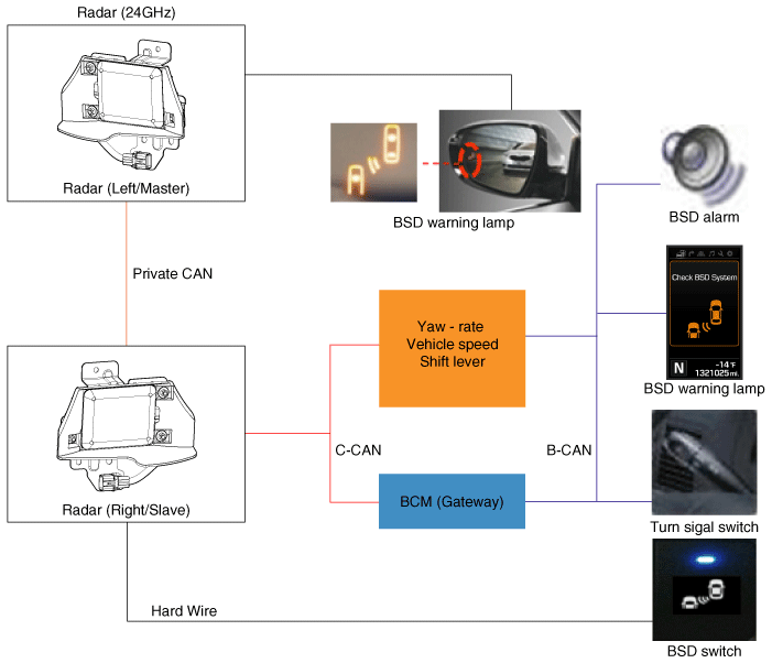 Обнаружение слепых зон (BSD): обнаруживает другие транспортные средства в зоне BSD и