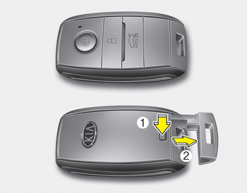 1.Нажмите и удерживайте кнопку разблокировки (1) и снимите механический ключ (2).