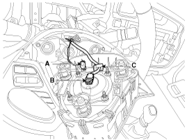 Снимите фиксатор проводки (С) и отсоедините разъем звукового сигнала (А).