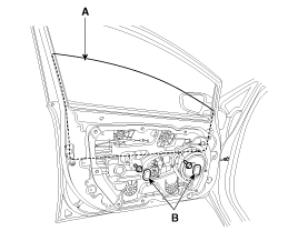 Снимите заглушку монтажного отверстия стекла передней двери (В).