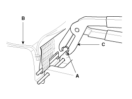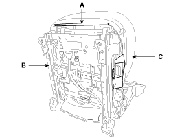 Сдвиньте протектор (A), а затем чехол подушки переднего сиденья (C) с рамы переднего сиденья (B).
