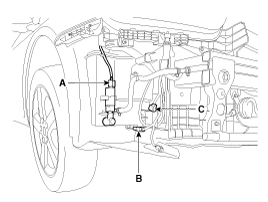 Снимите шланг омывателя и отсоедините разъем электродвигателя омывателя (А), разъем датчика уровня омывающей жидкости (В) и разъем насоса омывателя фар (С).