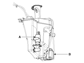 Снимите электродвигатель омывателя (А) и насос омывателя фар (В).