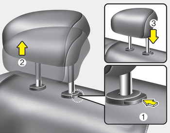Чтобы поднять подголовник, потяните его вверх желаемое положение (1). Чтобы опустить подголовник, нажмите и удерживайте кнопку разблокировки (2) на опоре подголовника и опустите подголовник в нужное положение (3).