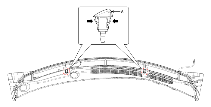 Снимите форсунку омывателя с подогревом (А) после освобождения фиксированных крючков.