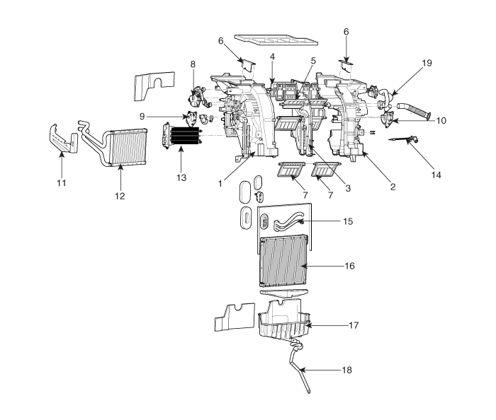 12. Сердцевина нагревателя 13. Нагреватель ПТК 14. Датчик температуры испарителя 15. Трубка испарителя 16. Сердечник испарителя 17. Нижний корпус нагревателя и испарителя 18. Сливной шланг 19. Шланг аспиратора |