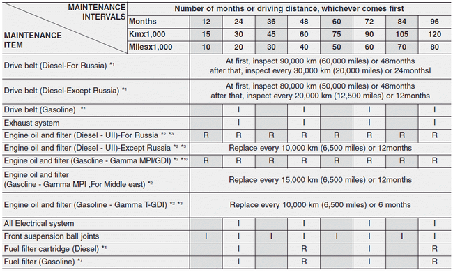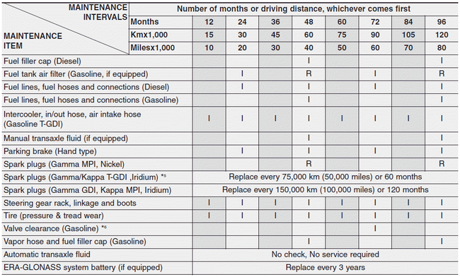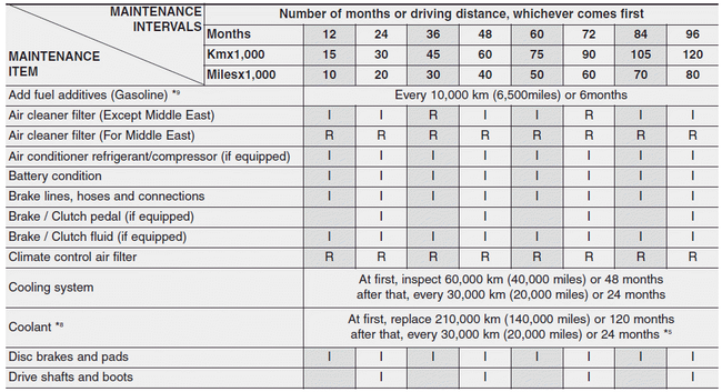 Следующие работы по техническому обслуживанию должны быть выполнены для обеспечения хорошей эмиссии контроль и производительность. Сохраняйте чеки для всех услуги по выбросам транспортных средств для защиты вашей гарантии. Где и пробег и время показаны, периодичность обслуживания определена в зависимости от того, что произойдет первым.