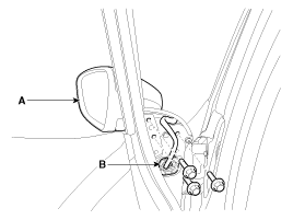 Отсоедините разъем наружного зеркала заднего вида (В).