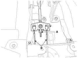 Установите трос стояночного тормоза (А), а затем установите зажим (В).