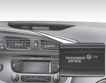 Индикатор включения передней подушки безопасности пассажира также загорается, когда пассажир переключатель ВКЛ/ВЫКЛ передней подушки безопасности установлен в положение ON и гаснет примерно через 60 секунд.