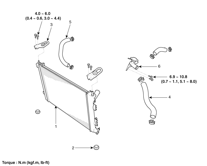 5. Нижний шланг радиатора 6. Заливная горловина в сборе |