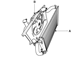 Снимите охлаждающий вентилятор и расширительный бачок (А) с радиатора (В).