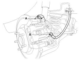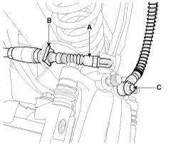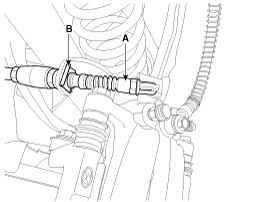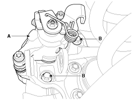 Снимите трос стояночного тормоза (А), предварительно сняв зажим (В).