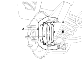Замените держатели колодок (C) и тормозные колодки (B) в держателе суппорта.