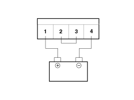 Подсоедините положительный (+) провод аккумулятора к клемме 1, а