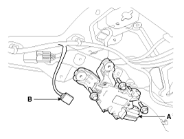 Отсоедините разъем электродвигателя заднего стеклоочистителя (В), затем снимите задний стеклоочиститель.