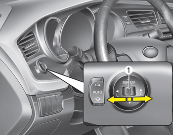 Электрический переключатель зеркала с дистанционным управлением позволяет регулировать положение левое и правое наружные зеркала заднего вида. К отрегулируйте положение любого зеркала, переместите рычаг (1) в положение R (вправо) или L (влево), чтобы выберите правое боковое зеркало или левое боковое зеркало, затем нажмите соответствующую точку на регуляторе регулировки зеркала в положение выбранное зеркало вверх, вниз, влево или верно.