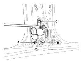 Ослабьте болты крепления преднатяжителя ремня безопасности (В, С) и снимите