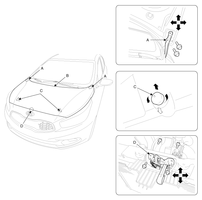 Ослабив болты крепления защелки капота (D), отрегулируйте защелку