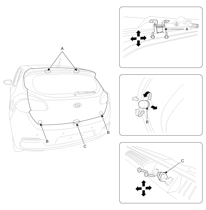 Ослабив болты крепления фиксатора задней двери (С), отрегулируйте