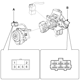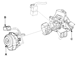 Отсоедините разъем выключателя зажигания (В) и сигнализатор ключа.