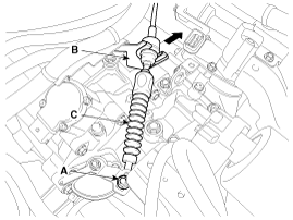 Снимите трос (C) с кронштейна троса (B) на коробке передач с двойным сцеплением.