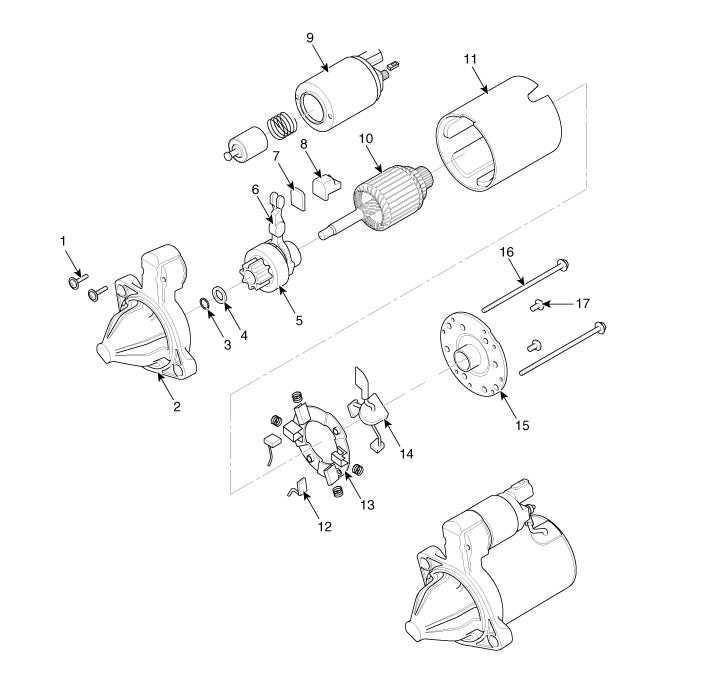 11. Хомут в сборе 12. Кисть (-) 13. Щеткодержатель 14. Кисть (+) 15. Задний кронштейн 16. Сквозной болт 17. Винт |