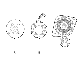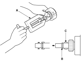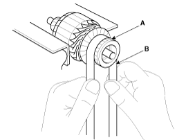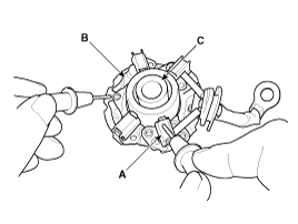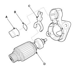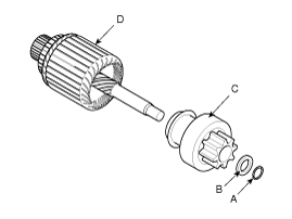 Снимите стопорное кольцо (В), стопор (А), обгонную муфту (С) и якорь.