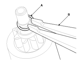 После снятия стопорного кольца (А) с помощью плоскогубцев (В).