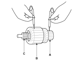 Убедитесь в отсутствии непрерывности между (+) щеткодержателем (A) и