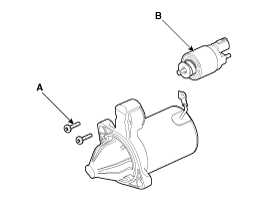 Отсоедините кабель стартера (B) от клеммы B на соленоиде.