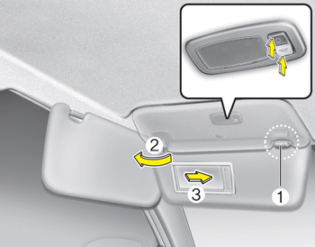 Чтобы воспользоваться косметическим зеркалом, потяните вниз козырек и откройте крышку зеркала (3).