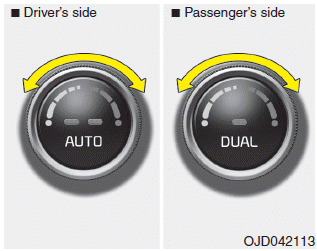 1. Нажмите кнопку DUAL для управления температура со стороны водителя и пассажира индивидуально. Также, если со стороны пассажира работает ручка регулировки температуры, он автоматически изменится на Двойной режим тоже.
