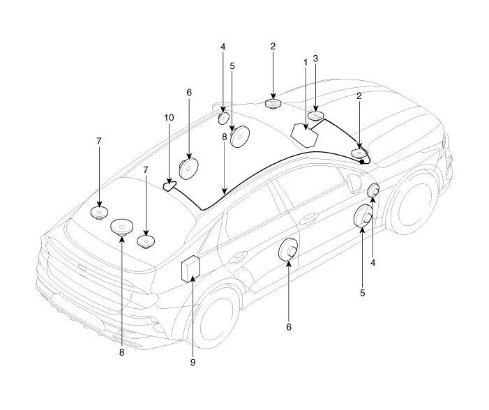 7. Объемный динамик 8. Сабвуфер 9. Внешний усилитель 10. Антенна на крыше |