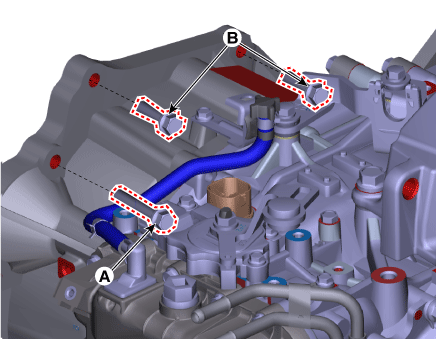 Ослабьте болт крепления стартера (А) и болты крепления коробки передач (В).