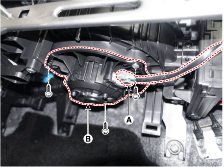 Разъедините разъем (А), ослабьте крепежные винты и снимите двигатель вентилятора (В).