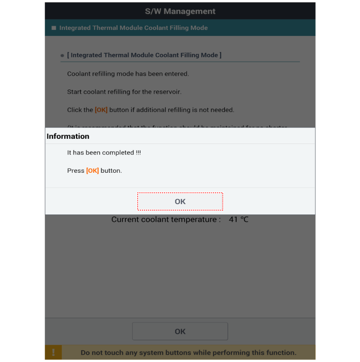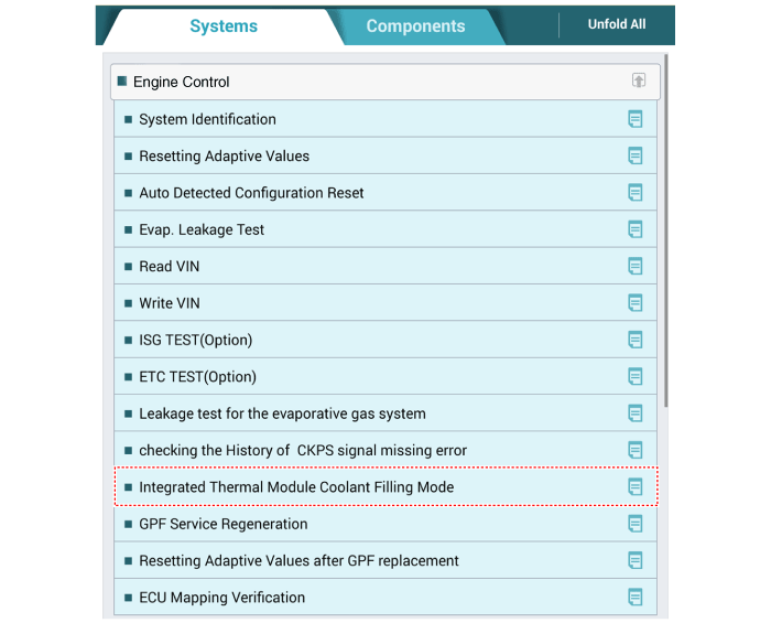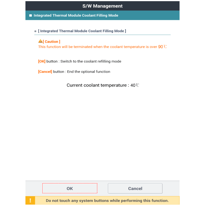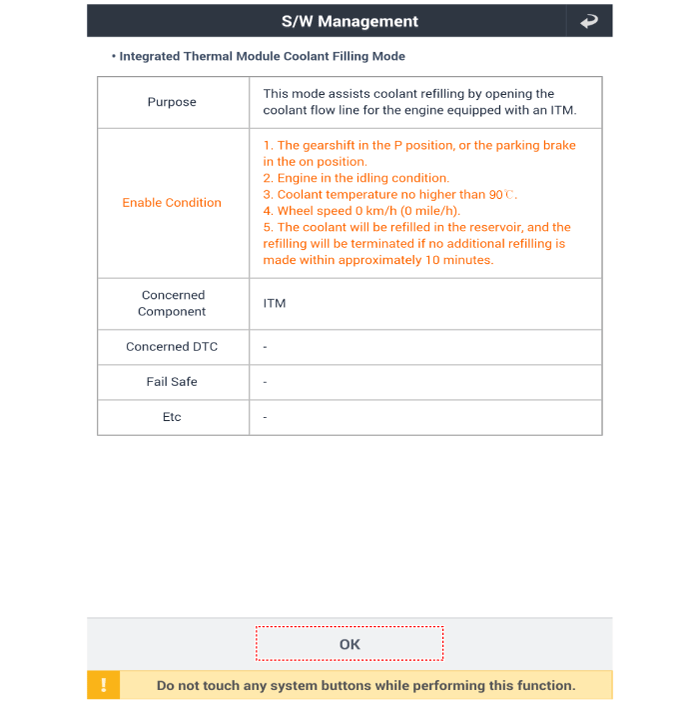 Выберите «Режим заправки охлаждающей жидкостью ITM» в «Управлении программным обеспечением автомобиля».