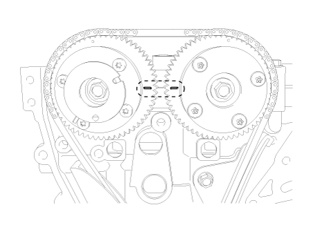 Поверните коленчатый вал на два оборота в рабочем направлении (по часовой стрелке), а затем убедитесь, что метки ВМТ звездочек CVVT находятся прямо линия на поверхности головки блока цилиндров.