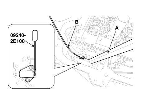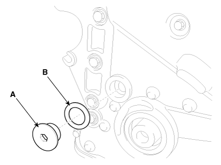 Сожмите поршень натяжителя с помощью рукоятки (А) и вставьте стопорный штифт (B) в отверстие на натяжителе для удерживания сжатого поршень.