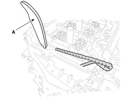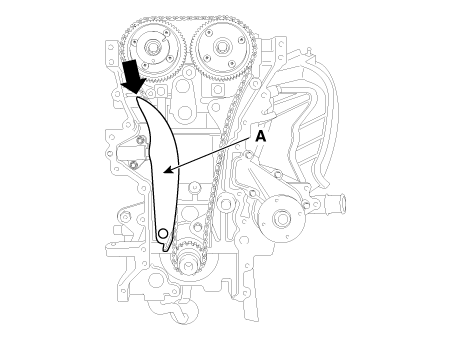 Поместите впускной распределительный вал (А) и затем вставьте рычаг натяжителя (В) вдоль цепь ГРМ.