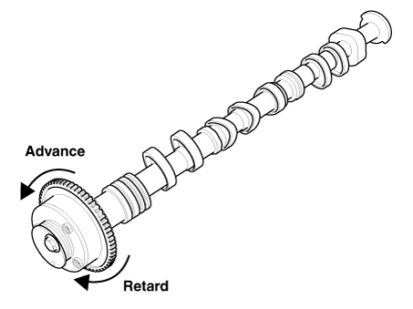 Система непрерывного изменения фаз газораспределения (CVVT) опережает или задерживает клапан. синхронизация впускного и выпускного клапана в соответствии с управляющим сигналом ECM который рассчитывается по частоте вращения двигателя и нагрузке.
