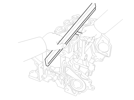Осмотрите верхнюю поверхность блока цилиндров на плоскостность. Используя прецизионную линейку и щуп, измерьте поверхность контакт с прокладкой головки блока цилиндров на предмет коробления.