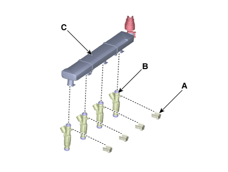 Отделите инжектор (B) от нагнетательного трубопровода (A) после удаления зажим (С).