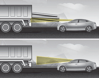 Если впереди идущее транспортное средство имеет груз, который выдвигается из кабины назад, или если перед вами транспортное средство с большим дорожным просветом, дополнительные специальные требуется внимание. Система FCA может быть не в состоянии обнаружить выдвижение груза. от автомобиля. В таких случаях необходимо соблюдать безопасный тормозной путь. от самого заднего объекта и, если необходимо, нажмите на педаль тормоза, чтобы уменьшить скорость движения для сохранения дистанции.