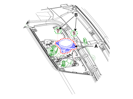 Снимите динамик экстренного вызова (A) после ослабления крепежных винтов (B).