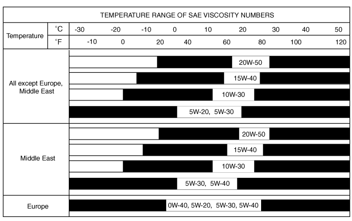 Все (кроме Ближнего Востока, Индии, Ливии, Алжира, Марокко, Туниса, Судана, Египет, Иран): ILSAC GF-4 и API SM или выше / 5W-20 ACEA A5 или выше / 5W-20 |